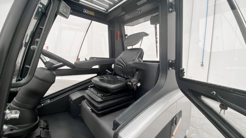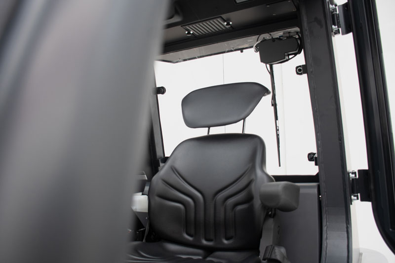 The vehicle guarantees the operator maximum comfort with its spacious seat and an integrated armrest with mini levers and control buttonsThe steering wheel is tiltable and height-adjustable.