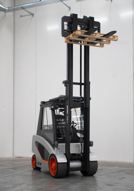 All the forklift functions are operated by advanced electronic inverters that control the two AC traction motors and the lifting process, both with high efficiency and low maintenance needs.