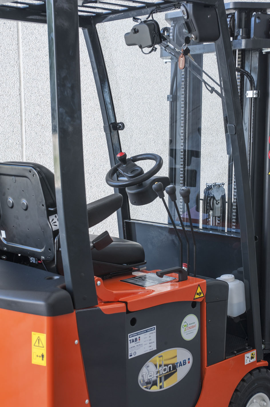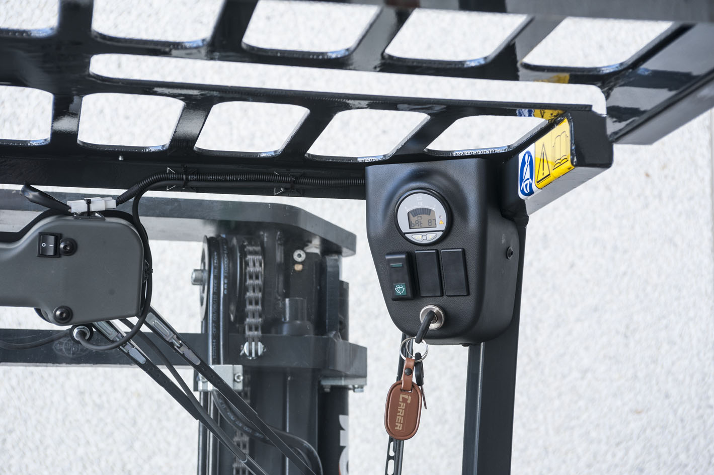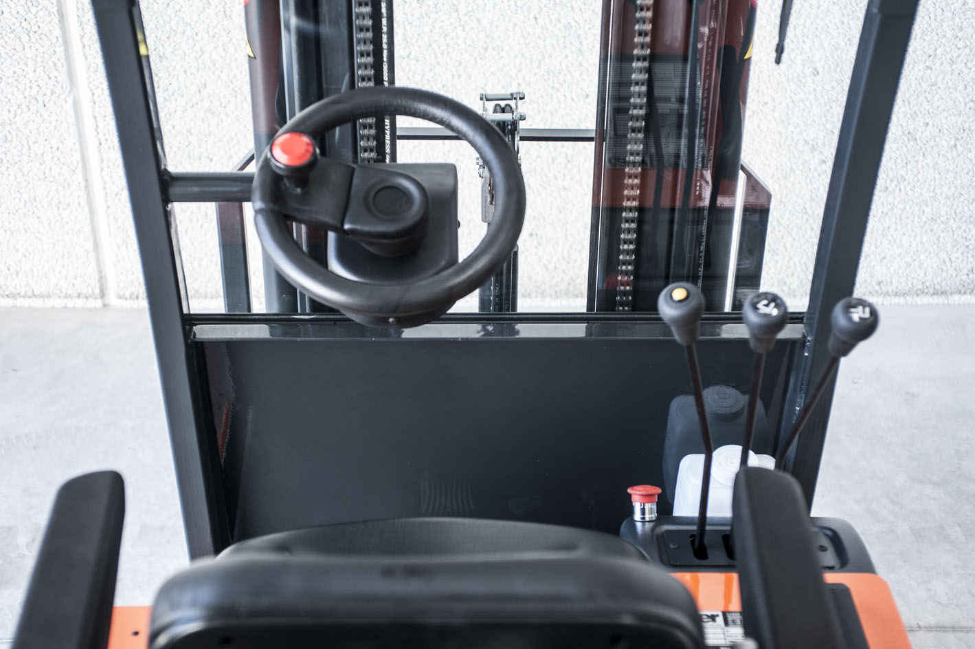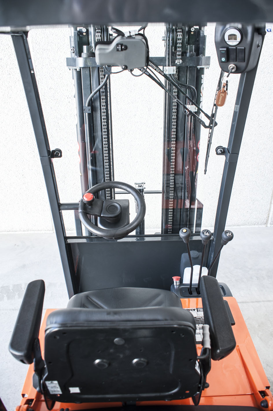 Il confortevole posto guida, i montanti a grande visibilità e la diposizione dei display, che visualizza tutte le funzioni e la diagnostica del carrello, permettono di avere sempre il controllo delle funzioni senza distogliere l'attenzione dal carico e di adeguare la posizione di guida alle esigenze dei carrellisti.